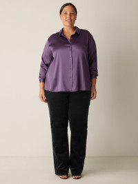 Classic—with a touch of shine. An elegant button-up shirt that goes straight into the wash, in our lustrous silk charmeuse. Made in a Fair Trade Certified™ factory. Style No. F5SM9-T5775 DESIGN - Close at the shoulders, wider at the hem. A silhouette that fits the body with ease. - Size XS measures 25 1/2 inches on the body. Size PS measures 24 1/2 inches on the body. Size 1X measures 28 1/2 inches on the body. - Classic collar, button front and button cuffs with double pleat. - Back yoke with center box pleat; 4-inch side slits. - Mother-of-pearl buttons. - Style No. F5SM9-T5775 FABRIC - Lustrous, satin-woven silk with a touch of stretch for movement. - Made in Vietnam. SUSTAINABILITY - Our Fair Trade Certified™ factories meet rigorous social and environmental standards. By choosing Fair Trade Certified™ products, you’re helping to improve the lives of workers, build resilient communities and protect the environment. - This fabric is bluesign® APPROVED. It's dyed with safer chemistry using less water and less energy, meeting the bluesign® CRITERIA.