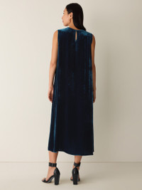 Understated elegance. The round neck dress with shirring at the neckline, in soft velvet with subtle shimmer. Made in a Fair Trade Certified™ factory. Style No. F5VLO-D5402 DESIGN - Close at the shoulders, wider at the hem. A silhouette that fits the body with ease. - Bo Boy is 5'9" and wears a size XS in Atlantis, which measures 50 inches on the body. Size PS measures 46 inches on the body. - Round neck, shirring at center front neckline. - Center back keyhole with mother-of-pearl button closure. - Style No. F5VLO-D5402 FABRIC - Our signature viscose silk velvet, now made in part from pulp derived from recycled cotton. - Machine wash cold. Tumble dry low. Do not dry clean. - Made in Indonesia. 80% Viscose/20% Silk. SUSTAINABILITY - Our Fair Trade Certified™ factories meet rigorous social and environmental standards. By choosing Fair Trade Certified™ products, you’re helping to improve the lives of workers, build resilient communities and protect the environment. - This fabric is bluesign® APPROVED. It's dyed with safer chemistry using less water and less energy, meeting the bluesign® CRITERIA.