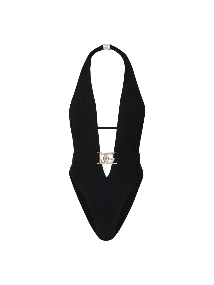 One-piece swimsuit with plunging neck and belt