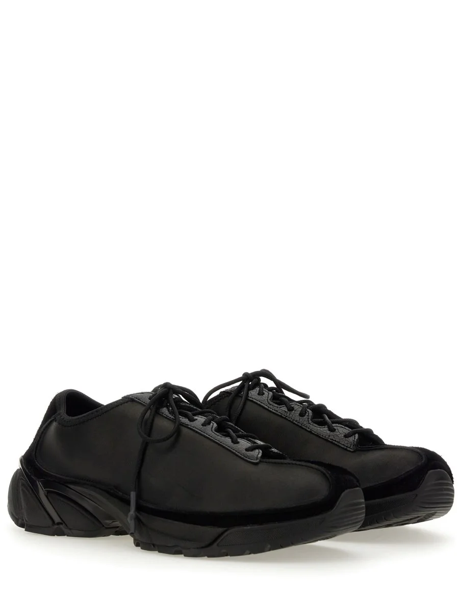 Queste sneakers piatte in pelle nera con chiusura a lacci di Our Legacy sono la combinazione perfetta di stile e comfort. Realizzate in pelle di alta qualita, offrono resistenza e un look elegante. La chiusura con lacci garantisce una calzata sicura, mentre la suola piatta offre un eccellente supporto per essere indossata tutto il giorno. Che stiate andando in ufficio o uscendo per un'uscita informale, queste sneakers eleveranno il vostro outfit e faranno sentire i vostri piedi a proprio agio. Composition - 100% COW LEATHER (BOS TAURUS) - MADE IN Portugal
