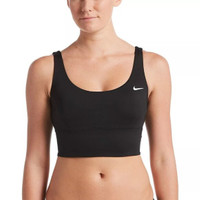 Nike Women's Scoop Neck Black Midkini Swim Top Size XS Enjoy a day at the pool or on the beach in comfort with the Nike Essential Midkini Swim Top. It works for a wide range of activities with its medium-support design, extra coverage and flattering cut. Medium-support straps work for a wide, middle range of sizes and activity. Adjustable straps offer a customizable fit. Removable soft cups deliver adjustable coverage and comfort. Cup stabilizer pockets secure cups in place to help reduce distractions. Fully lined design provides a better fit and support. Heat-transferred Swoosh design 83% polyester/17% elastane Hand wash