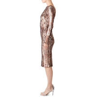 Metallic sequins radiate glamour on this Dress The Population sheath that's both demure and dramatic. Matte bronze multi brush stroke sequins on mesh (92% Polyester, 8% Spandex mesh base). Sheath. Long sleeves. Boat neckline. Hidden back zipper closure. 45" from shoulder to hemline. Imported.