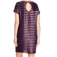 FRENCH CONNECTION Evening Shift Dress Retail $298 Versatile shift dress featuring a relaxed fit Round neck with short sleeves Pull on with back keyhole and button closure Lined Above knee Matte navy blue sequin stripes over Rich burgundy satin Dry clean Length 32.5" Shoulder 14.5" Chest 16.5" Sleeve 5.5" SZ 0 *New with tags