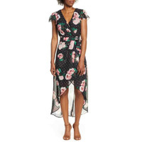 Julia Jordan Faux Wrap Dress Black Dots Pink Floral High Low Chiffon Sz 12 NWT