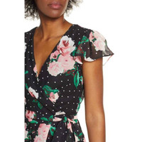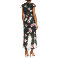 Julia Jordan Faux Wrap Dress Black Dots Pink Floral High Low Chiffon SZ 6 NWT