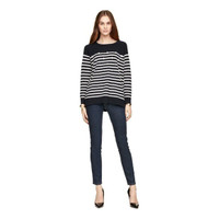 KATE SPADE Striped Crystal Embellished Relaxed Fit Sweater Retail $328 A cozy pullover made from extra-fine merino wool is fashioned with classically chic stripes and decorated with assorted crystals that add sparkle to any weekend look. A navy-and-cream striped pullover embellished with sparkling crystals, this stylish sweater is a great layering piece. Relaxed fit Knit body with contrast stripes 100% extra fine merino wool. Long sleeves. Crewneck. Embellished front. Ribbed neck, cuffs and hem Side split hem Dry clean only. Length 25" - 26" Shoulder 20.5" Chest 19.5" Sleeve 17.5" SZ Small *New with tags - See Photos & Measurements