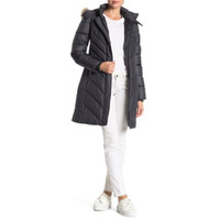 Larry Levine Hooded Puffer Jacket Pewter Grey Mid Length Faux Fur SZ XS NWT