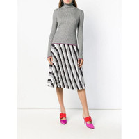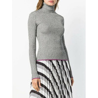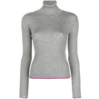 MARCO DE VICENZO Ribbed Lurex Glitter Turtleneck Grey ribbed turtle neck sweater from Marco De Vincenzo featuring long sleeves, a straight hem and a fitted silhouette. Made in Italy High collar Contrasting purple cuffs and hem Composition: 86% Acetate, 8% Polyester, 6% Polyamide Dry clean Length (shoulder to hem) 23.25" Shoulder 14.25" Chest 15.5" Sleeve 27" SZ IT 44/ US L *New with tags