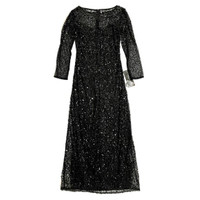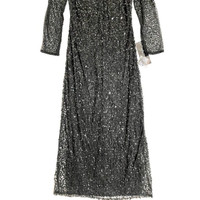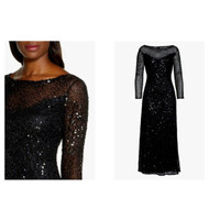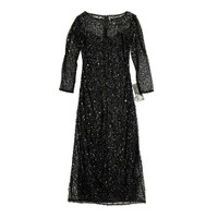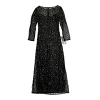 Pisarro Nights Black Sequin Illusion Evening Gown This ankle-swaying gown goes to whole new depths of elegance, with intricate sequin beading upon sheer mesh Hidden back-zip closure Bateau neck 3/4 sleeves Partially lined 100% rayon Spot clean Length 55" Shoulder 15" Chest 17.5" Sleeve 20.5" Waist 15" SZ 4 *New with tags - See Photos & Measurements
