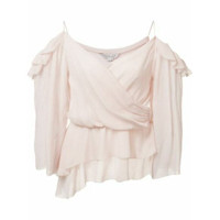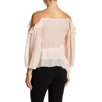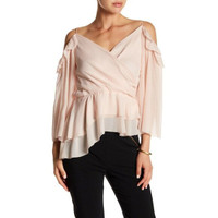 RACHEL ZOE Renee Cold Shoulder Silk Blush Pink Top Surplice neck Ruching at sides Lightly elasticized waist Asymmetrical ruffled hem Shell: 100% silk Combo: 100% silk Lining: 100% silk Dry clean Fit: this style fits true to size. length (shoulder to hem) 24" - 28" Chest 17.5" Waist 15.5" Sleeve 15" SZ 10 *New with tags