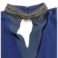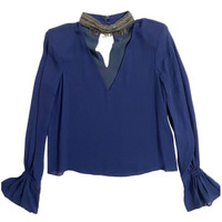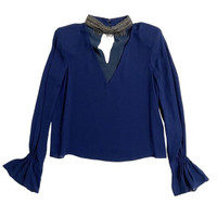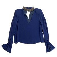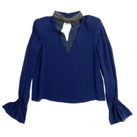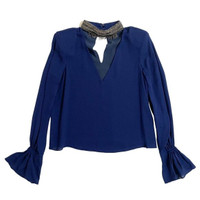 Ramy Brook Annete Embellished Silk Bell-Sleeve Blue Blouse SZ S New - Defects