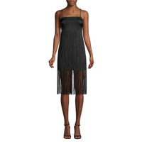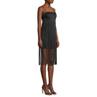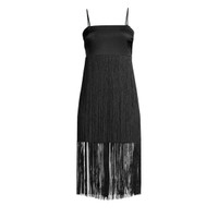 RAMY BROOK Rikki Black Fringe Trim Mini Dress Retail $495 Glamorous dress with tone-on-tone fringes that move as you do Adjustable spaghetti straps Empire waist Concealed back zip Triacetate/viscose Dry clean Length 31" Chest 15.5" Waist 14.5" Hips 20" SZ 4 *New with tags
