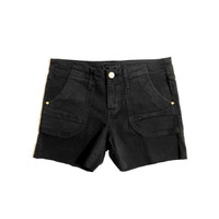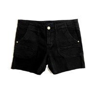 SANCTUARY Black Denim Cutoff Cargo Shorts Cargo pockets Branded brass hardware Snap flap back pockets Raw hems 92% cotton, 7% polyester, 1% spandex Machine wash cold Inseam 4.25" Front rise 8.75" Back rise 12.75" Leg opening at the hip Waist 15" SZ 27 *New with tags. See Photos & Measurements