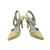 TOPSHOP GEM Embellished Court Satin Dress Heels Bring the bling with a pointy-toe pump balanced on a slim stiletto heel and topped with a crystal-embellished ankle strap. 4" stiletto heel Mustard yellow satin upper Adjustable crystal pave ankle strap with button closure Fabric upper, leather lining, manmade sole Runs small; order next size up SZ 37 EU *New without box - See Photos & Measurements