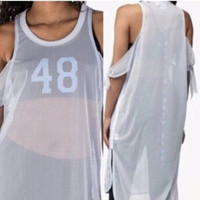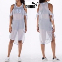PUMA Xtreme Mesh Halogen Blue Dress Show off your streer style in this PUMA Extreme Dress. 1948 lettering at back and 48 on front Side slits and racing stripe for freedom of movement Cold shoulder with side sleeve ties See through mesh fabric Polyester Machine wash cold Length 41" - 45" Shoulder 12" Chest 24" SZ L *New with tags. see Photos & Measurements