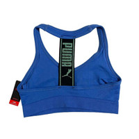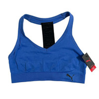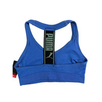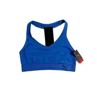 Puma Blue Racer Back Glitter Strap Sports Bra V neck Pullover style Racerback with metallic logo design Low impact activity Front logo Stretch fit Machine wash SZ S *New with tags