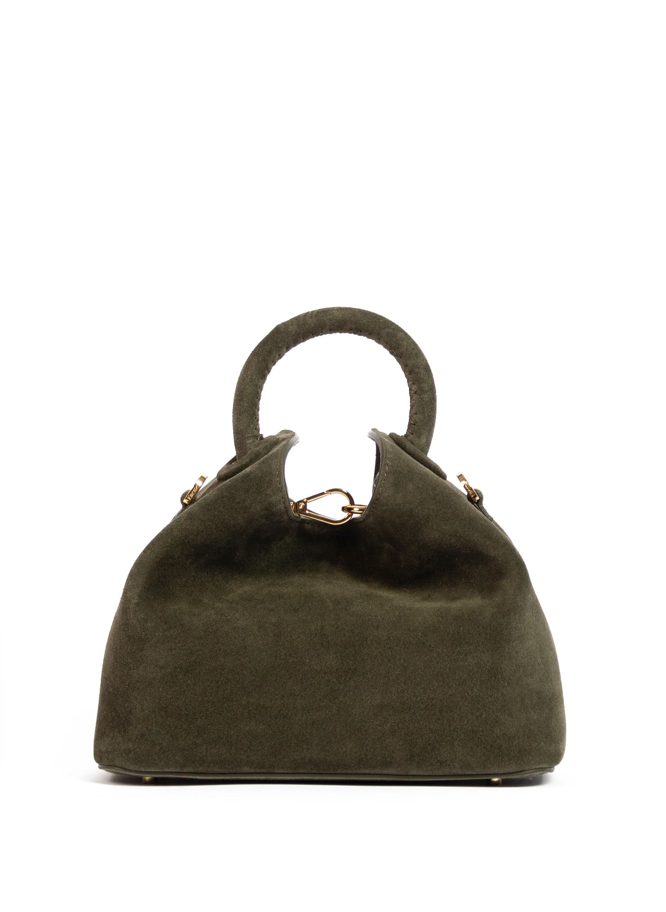 Size: Width: 23cm // 9" Height: 18cm // 7" Depth: 12cm // 4,7" Weight: 415g Strap drop: 46cm to 53cm // 18" to 20" Description: Inspired by the shape of the Chinese "Dumpling", the Baozi bag is the medium size of the signature line, featuring functionality and Italian craftsmanship Adjustable strap for shoulder or crossbody wear Inner zip and flat pockets Magnetic closure 18k gold-plated hardware Protective studs on the bottom Made in Italy The model is 1.78m Material: Exterior: 100% Suede Leather from Italian tannery Lining: Microfiber suede