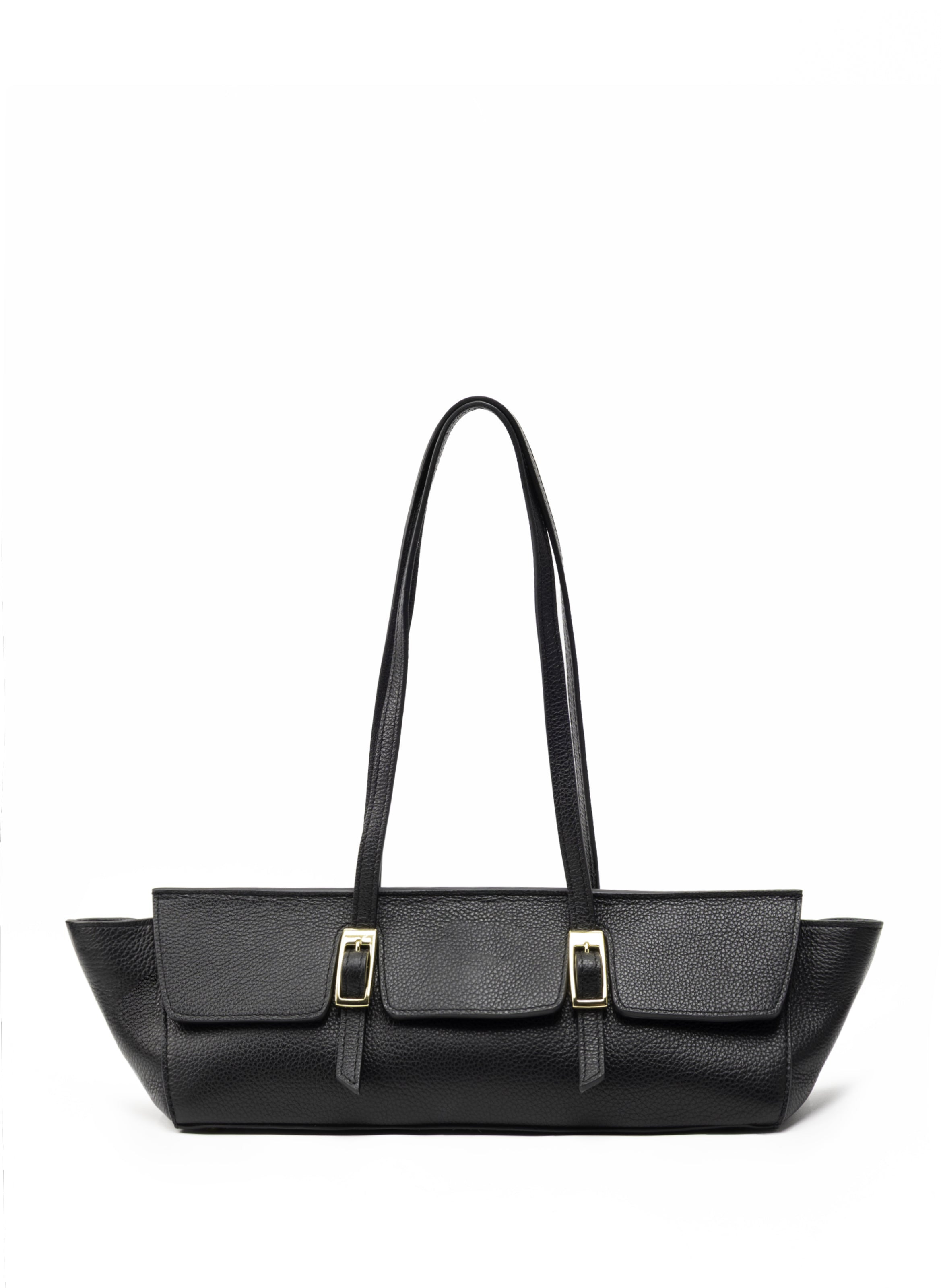 A sleek east-west shoulder bag with a structured silhouette and signature Elleme buckles, designed to carry your daily essentials with effortless elegance. Details Top width – 42cm // 16.5” Bottom width – 30cm // 11.8” Height – 12cm // 4.7” Depth – 10cm // 3.9” Strap drop – 25cm // 9.8” Exterior: 100% Cow Pebbled Leather Lining: Microfiber suede Inner zipped pocket Magnetic closure 18k gold plated hardware Made in Italy Protective metal feet