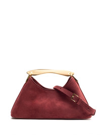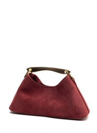 Contemplating the latest trends, the mini version of the bestselling Boomerang family is showcasing a metal handle and with an elegant east-west shape, spacious enough to fit everything for a night out Details Width: 28cm // 11" Height: 14cm // 6" Depth: 10cm // 4" 46cm to 53cm // 18" to 20" Exterior: 100% Suede leather Lining: Microfiber suede Removable and adjustable shoulder strap Magnetic closure 18k gold plated hardware Protective studs on the bottom Made in Italy