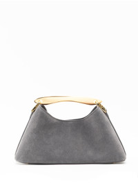 Contemplating the latest trends, the mini version of the bestselling Boomerang family is showcasing a metal handle and with an elegant east-west shape, spacious enough to fit everything for a night out Details Width: 28cm // 11" Height: 14cm // 6" Depth: 10cm // 4" Strap drop: 46cm to 53cm // 18" to 20" Exterior: 100% Suede leather Lining: Microfiber suede Removable and adjustable shoulder strap Magnetic closure 18k gold plated hardware Protective studs on the bottom Made in Italy