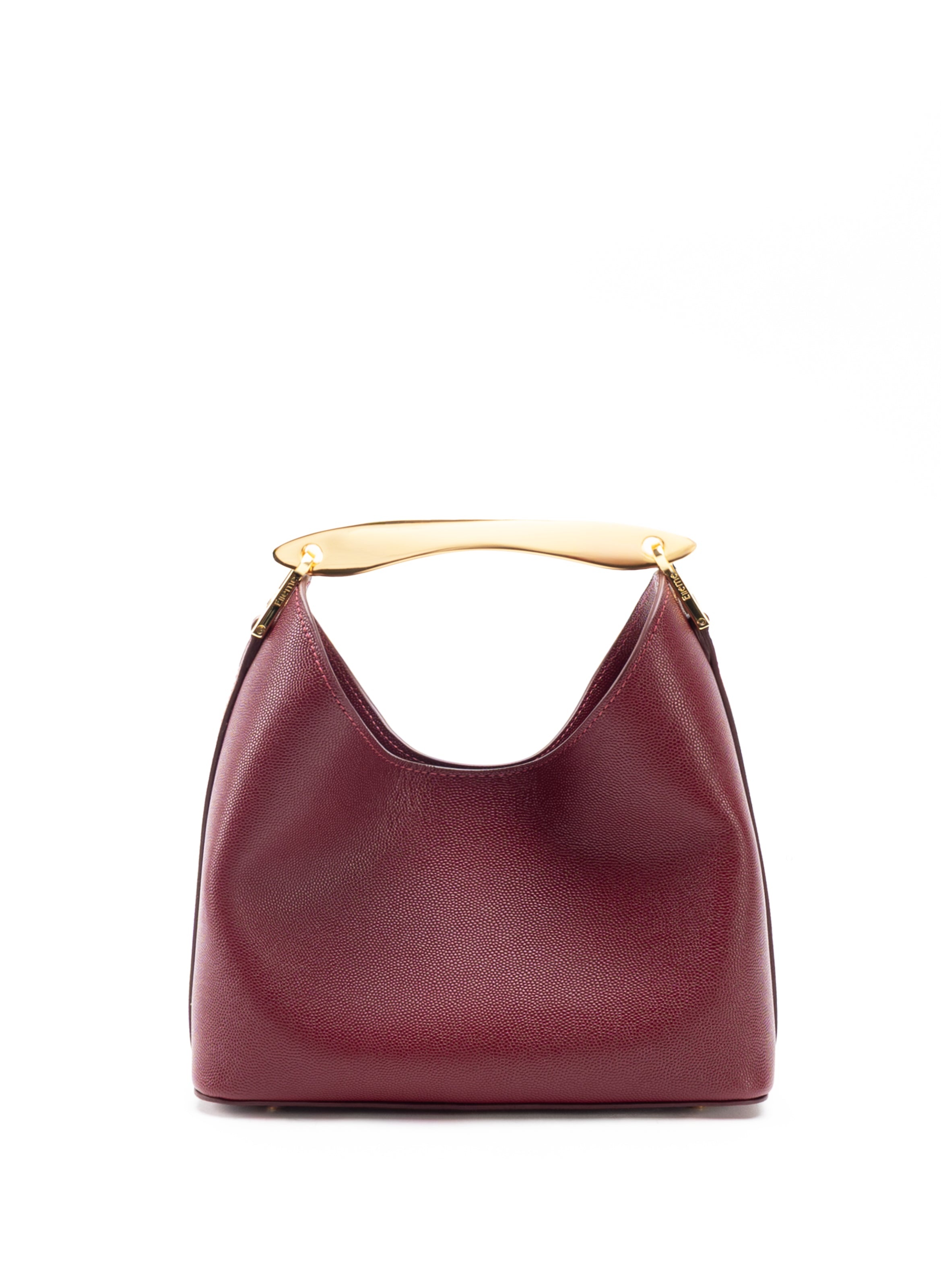 With its compact size, luxurious craftsmanship, and sophisticated metal top handle, the Boomerang Small pays homage to Elleme's signature aesthetic Details Width: 22cm // 9" Height: 22cm // 9" Depth: 10cm // 4" Weight: 400g 46cm to 53cm // 18" to 20" Exterior: 100% Textured Cow Leather from Italian tannery Lining: Microfiber suede Removable and adjustable strap for a shoulder or crossbody wear Inner flat pocket Magnetic closure 18k gold plated hardware Protective studs on the bottom Made in Italy