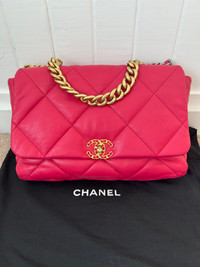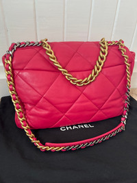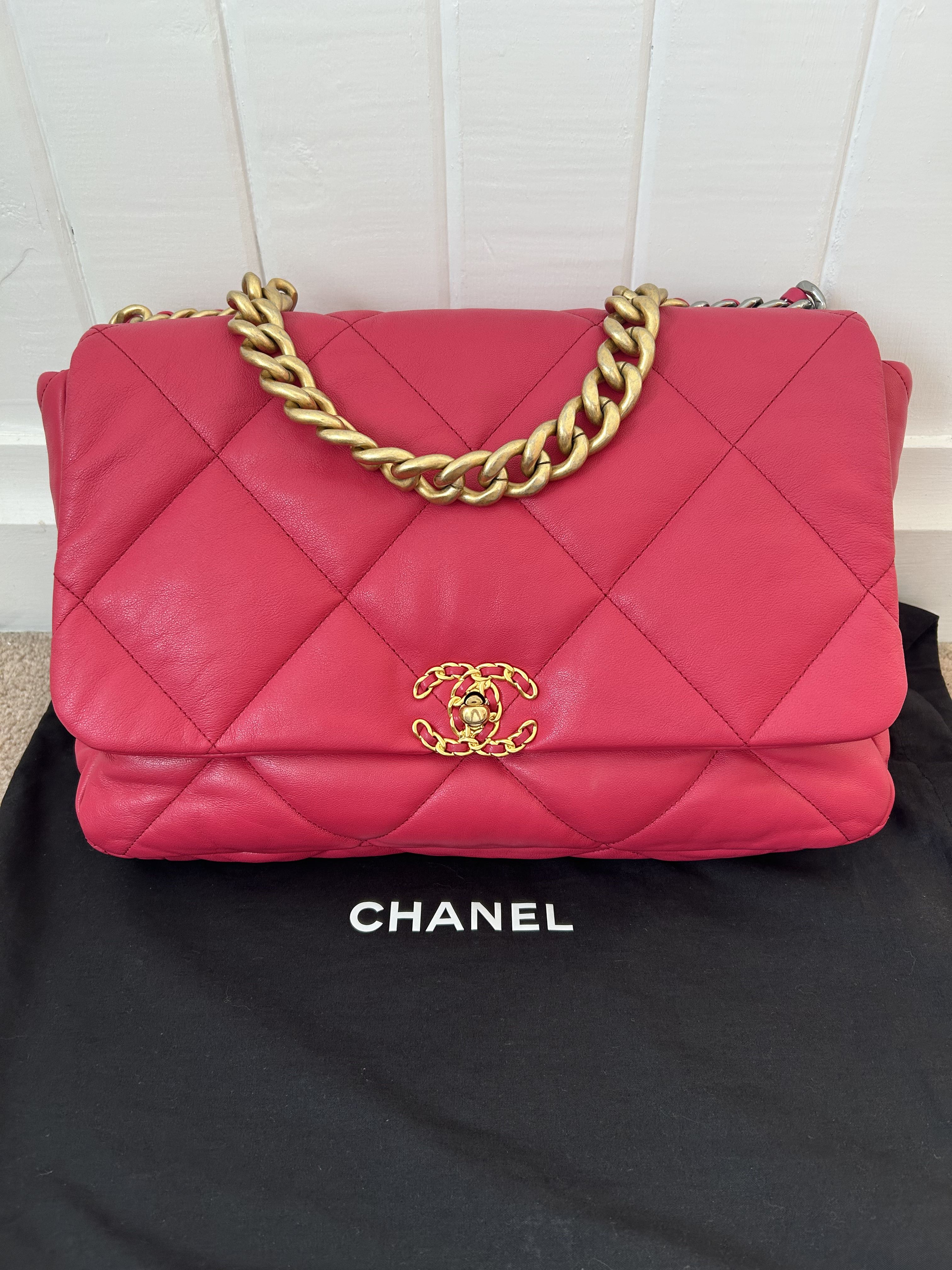 Chanel 19 is a timeless bag and this rare size and colour is highly collectible. The maxi/jumbo is 36x25x11 and perfect for everyday even fitting a laptop. In excellent condition with no marks at all and only used a handful of times. Stickers still on the hardware. The supple goatskin is so durable and the pink colour just screams Chanel! Contrast hardware in gold and palladium is in perfect condition. Comes with dust bag and 3rd party authentication. I can ship internationally. This is my first time listing on Reversible so please be kind 🩷
