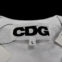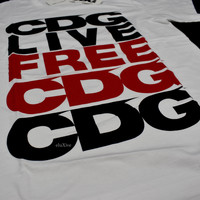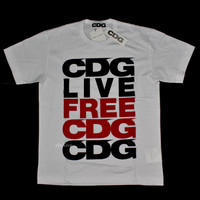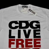Over 4000 grails sold, buy with confidence - New / unworn - From Comme des Garcons newly launched 'CDG' line - White 100% cotton jersey knit - 'CDG LIVE FREE' in black and red on front - Crewneck & short sleeves - Slim fit - Made in Japan - Size large Measurements Pit to pit: 20.5" Shoulder to shoulder: 19" Top of collar to bottom hem: 27" Shoulder seam to sleeve end: 7.5" Guaranteed 100% authentic and genuine All photos were shot by me. They are not stock photos.