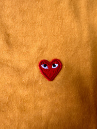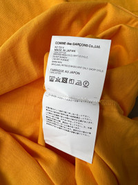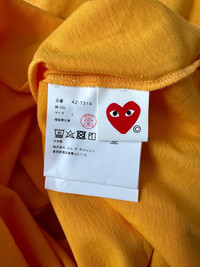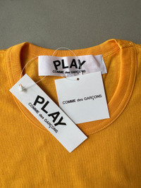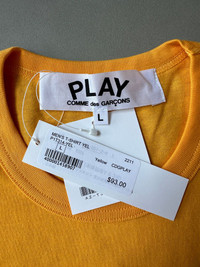 Over 4000 grails sold, buy with confidence MSRP: $93 - New / unworn - Taxi cab yellow 100% cotton knit - Small Comme des Garcons PLAY heart logo embroidered at chest - Crewneck & short sleeves - Slim fit - Made in Japan - Original tags still attached - Size L Measurements: Pit to pit: 20" Shoulder to shoulder: 17.75" Top of collar to bottom hem: 28" Shoulder seam to sleeve end: 8.25" Guaranteed 100% authentic and genuine. All photos show actual item