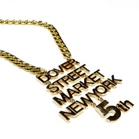 Over 4000 grails sold, buy with confidence - New / unused - Limited 2018 release for Dover Street Market's 5th Anniversary - Gold tone metal Cuban link chain - Linked together 'Dover Street Market New York 5th' pendant - Adjustable clasp - Sealed in original packaging Measurements: Chain length: 28.5" Chain width: 0.5" Pendant: 4" x 3.25" Guaranteed 100% authentic and genuine. All photos were shot by me. They are not stock photos.