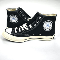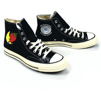 Over 4000 grails sold, buy with confidence - New / unworn - Rare 2022 release - Black cotton canvas upper - Sky High Farm Workwear "Strawberry-Moon" logo on outer sides - Custom Sky High Farm Workwear Chuck patch and back "license plate" - Custom cobranded insole - Dark brown rubber outsole, cream white rubber foxing - Comes with original box and special star printed laces Guaranteed 100% authentic and genuine. All photos were shot in-house. They are not stock photos.