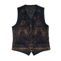 Over 4000 grails sold, buy with confidence Crazy rare, you won't see this anywhere else. Serious offers only. Retail was over $7k with taxes. MSRP: $6,745 - Brand new / unworn - 2014 runway collection - Fine navy blue velvet with allover Roman cathedral print in gold - Complete 3 piece suit (jacket, vest & pants). Will not sell separately. - Double breasted jacket with notch lapels, double vents & functional surgeon's cuffs - Flat front pants, adjustable vest, polished horn buttons all around - Slim fit - Original tags still attached. Original hanger included as well. - Size 50 EU (40R US size) - Handmade in Italy with incredible attention to detail Measurements: Coat Pit to pit: 20" Shoulder to shoulder: 17" Top of collar to bottom hem: 31.5" Shoulder seam to sleeve end: 26.75" Vest Pit to pit: 20" Shoulder to shoulder: 15.5" Top of collar to bottom hem: 27.5" Pants Waist (flat): 18" Inseam (un-hemmed): 37.5" Rise: 9" Leg opening: 7" Guaranteed 100% authentic and genuine. Bought at a Dolce & Gabbana private event. All photos were shot be me. I do not use stock photos.