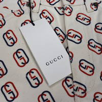 Over 4000 grails sold, buy with confidence Retail: $880 - New / unworn - Cream white cotton denim twill - Allover red and navy GG logo print - Flat front, zip fly, 5 pockets - Logo engraved metal buttons - Gucci logo leather patch on back - Original tags still attached - Slim fit - Made in Italy - Size 30 US Measurements Waist (flat): 14.75" Inseam: 5.25" Rise: 11.5" Leg opening: 11.5" Guaranteed 100% authentic and genuine All photos were shot by me. They are not stock photos.