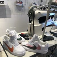 Over 4000 grails sold, buy with confidence - New / unworn - Unique 1/1 custom sneaker designed and sewn in-store at Nike's NYC Soho location. Only pair in the world - Premium white leather upper - Signature white Nike swoosh on sides - Orange overlapping oversized Nike swoosh logos - White 'Nike Air' on tongue and back heel - Bright green rope laces - Light blue metal lace tips and toggle locks - Orange metal lace dubraes with Off-White inspired 'ON WHITE' engraving - Solid white midsole and outsole - Comes with original box, tag, extra laces and lace dubraes - Size 9 US Guaranteed 100% authentic and genuine All photos were shot by me. They are not stock photos.
