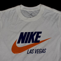 Over 3500 grails sold, buy with confidence - New / unworn - Deadstock 2018 Nike Las Vegas exclusive - White 100% cotton jersey knit - Navy & orange Nike Las Vegas logo on front - Crewneck and short sleeves - Original tag attached - Classic fit - Size small Measurements: Pit to pit: 25" Shoulder to shoulder: 20" Top of collar to bottom hem: 29" Shoulder seam to sleeve end: 10.5" Guaranteed 100% authentic and genuine. All photos were shot by me. They are not stock photos.
