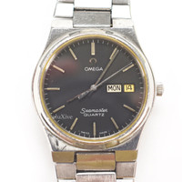 Over 4000 grails sold, buy with confidence MSRP: $5,200 (for comparable new model) - Pre-owned; very good original, unpolished condition - All-original vintage item from the 1980's - Stainless steel case and bezel - Dark gray waffle texture dial with day and date windows - Original stainless steel band (bracelet is a bit loose) - Quartz movement, keeps perfect time - Includes Omega service case - Several original extra links also included (already added to band) - Swiss Made - Note: Due to age, this watch does not come with a warranty or guarantee of water resistance Measurements Case width: 34 mm Band width: 5/8" Fitment: up to 8.25" wrist Guaranteed 100% authentic and genuine. All photos were professionally shot by us and show the exact item for sale.