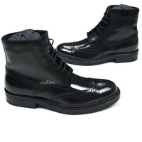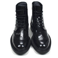 Over 4000 grails sold, buy with confidence MSRP: $1,045 - Brand new / unworn - Classic mid top 'Army' style - Fine black patent leather upper with brogue details - Leather lining - Thick rubber lug outsole - Comes with original box and dust bags - Made in Italy - Size 41 EU (8 US) Measurements: Insole: 10.5" Outsole: 11.5" Heel width: 3" Forefoot width: 4.5" Guaranteed 100% authentic and genuine. All photos were shot by me and show the exact item for sale.