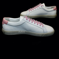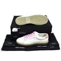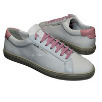 Over 4000 grails sold, buy with confidence MSRP: $590 - Brand new / unworn - White canvas upper with pink and white calfskin trim - White calfskin leather lining - Saint Laurent logos on sides and back tab - Classic, retro low top design - Hand-distressed beige rubber cup sole - Comes with original box, dust bags, tags and extra set of laces - Made in Italy - Size 43 EU / 10 US Measurements: Insole: 11" Outsole: 11.75" Heel width: 2.75" Forefoot width: 4" Guaranteed 100% authentic and genuine All photos were shot by me. They are not stock photos.