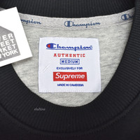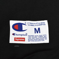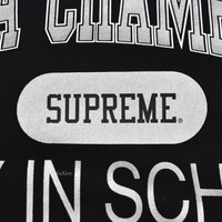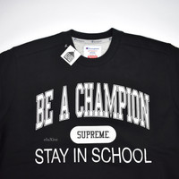 Over 4000 grails sold, buy with confidence - New / unworn - Deadstock S/S 2018 release - Black cotton blend fleece knit - Metallic "Be a Champion / Stay in School" print on front - Supreme logo print in center - Champion 'C' logo patch on sleeve - Supreme / Champion logo patch near bottom hem - Crewneck, ribbed cuffs - Relaxed fit - Original tags still attached - Size Medium Measurements: Pit to pit: 23.75" Shoulder to shoulder: 19" Top of collar to bottom hem: 29.5" Shoulder seam to sleeve end: 25.5" Guaranteed 100% authentic and genuine. All photos were shot in-house. They are not stock photos.