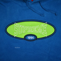 Over 4000 grails sold, buy with confidence - New / unworn - Deadstock S/S 2018 release - Dark aqua heavy-knit 100% cotton reverse fleece - Lime green and white Supreme logo on front - Hidden slit pockets, long sleeves, ribbed cuffs, drawstring hood - Tonal box logo tag at bottom hem - Classic fit - Made in Canada - Size medium Measurements: Pit to pit: 23" Shoulder to shoulder: 19" Top of collar to bottom hem: 26" Shoulder seam to sleeve end: 25.5" Guaranteed 100% authentic and genuine. All photos were shot in-house. They are not stock photos.