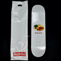 Over 4000 grails sold, buy with confidence - Brand new / unused - Deadstock S/S 2018 release - Made of white painted wood - Supreme chicken dinner graphic on bottom of deck - Black stained top with Supreme box logo and 'World Famous' script - Sealed in original packaging, includes Supreme store skateboard bag Guaranteed 100% authentic and genuine All photos were shot by me. They are not stock photos.