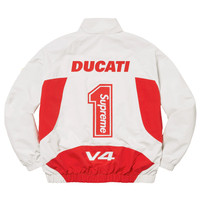 Over 4500 graisl sold completed, buy with confidence - Brand new / unused - Deadstock SS24 release - Light gray Supplex nylon shell with red accents - Supreme and Ducati logo prints on front and back - Embroidered patches on front and sleeves - Full zip front, mesh lining, slit pockets, elastic cuffs - Sealed in original package - Size Medium Guaranteed 100% authentic and genuine First 3 photos from Supreme. Item you receive will be sealed in bag exactly as shown in the photos.