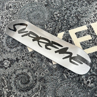 Over 4500 graisl sold completed, buy with confidence - Brand new / unused - Deadstock SS24 release - Metallic silver painted wood - Futura script SUPREME logo on bottom of deck - 'You was raised off our shit' print on top of deck - Sealed in original package Guaranteed 100% authentic and genuine All photos show actual item