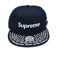 Over 3800 grails sold, buy with confidence - New / unworn - Deadstock F/W 2021 release - Navy twill upper - Embroidered tonal Supreme box logo on front - Intricate embroidery on brim - Embroidered 'Count the Rings / World Famous' on back - Embroidered New Era flag on side - 6-Panel, fitted - Original tags still attached -Size: 7 1/4 Guaranteed 100% authentic and genuine. All photos were shot by me and show the exact item for sale