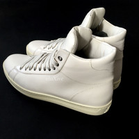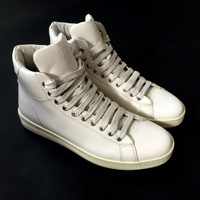 Over 4000 grails sold, buy with confidence! MSRP: $1,090 - Brand new & unworn - S/S 2016 runway collection - Bone white genuine calfskin leather upper & lining - Classic high-top tennis / court style profile - Metal eyelets, logo details at tongue and back tab - Off-white premium rubber outsole - Comes with original box & dust bags - Made in Italy - Size 8.5 - NOTE: left shoe has some yellowing and marks from display Measurements: Size 8.5 US Insole: 10.875" Outsole: 11.5" Forefoot width: 4" Heel width: 2.875" Guaranteed 100% authentic and genuine, purchased at Tom Ford in NY. All photos were taken by me and shoe the exact shoes you will receive.