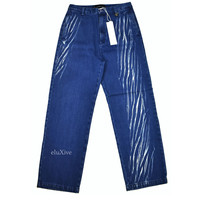 Over 4000 transactions completed, buy with confidence MSRP: $470 - New / unworn - 2021 runway collection - Made of thick dark blue denim with spiral effect on front and back - 4-Pocket design, zippered fly, logo engraved button - Engraved silver tone metal charm on front - Slim at waist, baggy through leg - Original tag still attached - Size 32 US / 48 EU Measurements: Waist (flat): 15" Inseam: 29.5" Rise: 14" Leg Opening: 9" Guaranteed 100% authentic and genuine. All photos were shot by me. They are not stock photos.