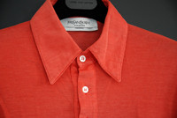 Yves Saint Laurent polo shirt in coral with botton down collar (hidden buttons). Size: S (fits small/tight, like XS(?)) Measurements (approximate): Shoulder width - 43 cm Armpit to armpit - 45 cm Arm length - 20 cm Length from neck to hem - 62 cm Material: 55% Silk 45% Cotton Condition: Good. Only used a few times because of the small sizing.