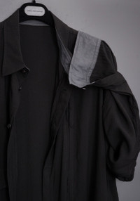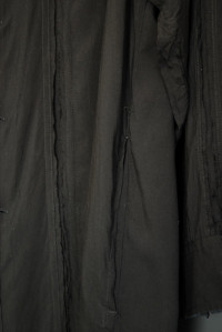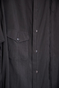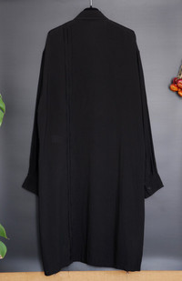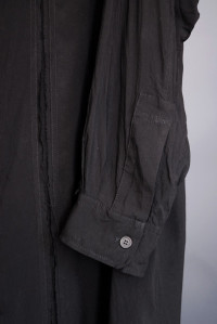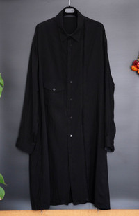Yohji Yamamoto Pour Homme long oversized black shirt (overshirt) with one chest pocket and two hidden side pockets. Fringed channels on the front, back and both arms. Contrasting color on inner collar and inner cuffs. From the spring/summer 2016 collection Size: 3 Measurements (approximate): Shoulder width - 56 cm Armpit to armpit - 70 cm Arm length - 64 cm Length from neck to hem - 112,5 cm Material: 100% Tencel Other parts: 100% Cotton Condition: Used a few times. One repair at the last/lowest button (not really visible). Comes with tags, extra fabric and buttons.