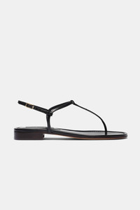 The Cecilia t-strap sandal slips on and elegantly exposes a nearly nude foot. These refined sandals are finished with an adjustable strap to secure the vamp and heel. These sandals have a lightly padded insole, smooth leather lining, and a leather sole, which will mold to your foot as you wear them. SIZE & FIT - Fits true to size, take your normal size - Fits regular or narrow feet best MATERIALS & DETAILS - Heel Measurement: .7" / 10mm - Black calfskin leather - Buckle ankle strap - Made in Italy