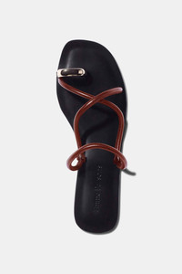 A sleek design with a gold toe ring that elevates an evening out, the Laurie’s soft nappa cording crisscrosses over the vamp of the foot. This sandal is designed with a strap to fit across the vamp of the foot. The strap may fit around the ankle on certain feet but will feel more comfortable when worn across the vamp. SIZE & FIT - Fits small, we recommend sizing up a half size - Fits regular or narrow feet best MATERIALS & DETAILS - Heel Measurement: .5" / 10mm - Brown nappa leather - Gold tone Zamac toe ring - Made in Italy - Leather Working Group certified for responsible leather production