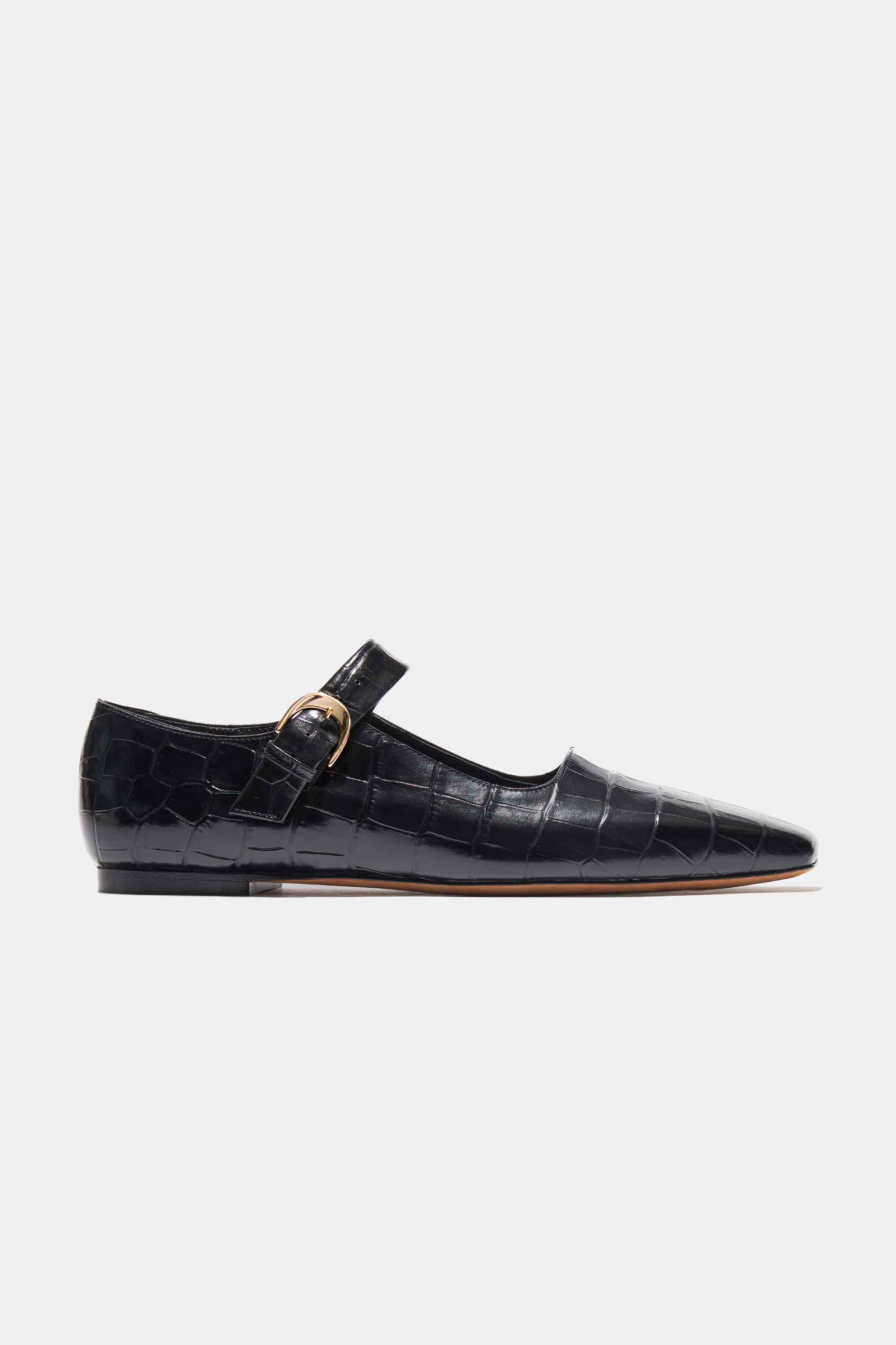A sophisticated take on a beloved silhouette, the Tramonto Mary Jane features an angled square toe that feels directional and elongates the leg.There may be a small amount of extra space at the front of these shoes. This is an intentional design element that creates a modern, elongated toe shape. SIZE & FIT - Fits true to size, take your normal size - If between sizes, size up to the nearest whole size - Fits regular or narrow feet best MATERIALS & DETAILS - Heel Measurement: .3" / 8mm - Black croc embossed calfskin leather - Buckle ankle strap - Made in Italy - Leather Working Group certified for responsible leather production